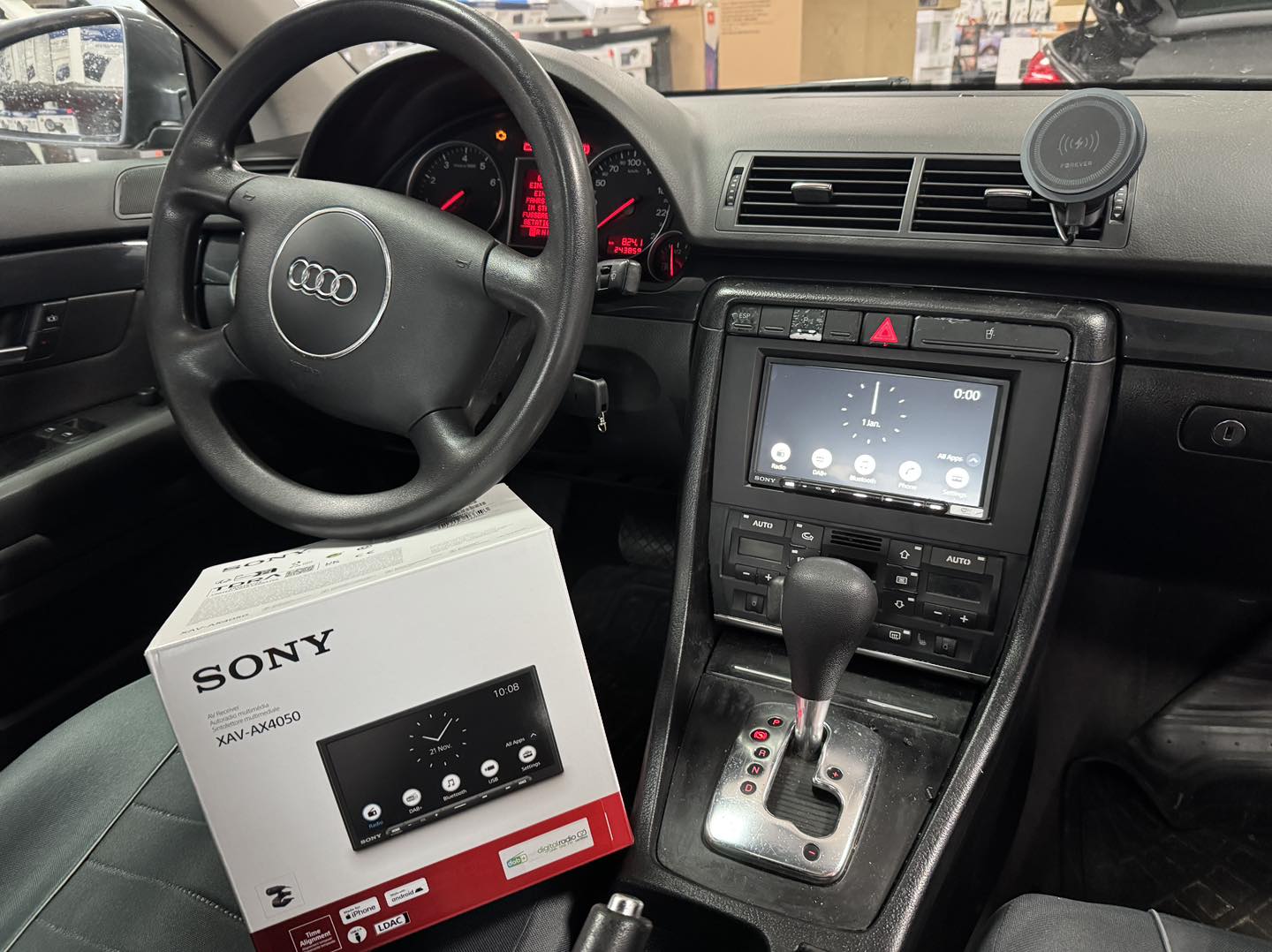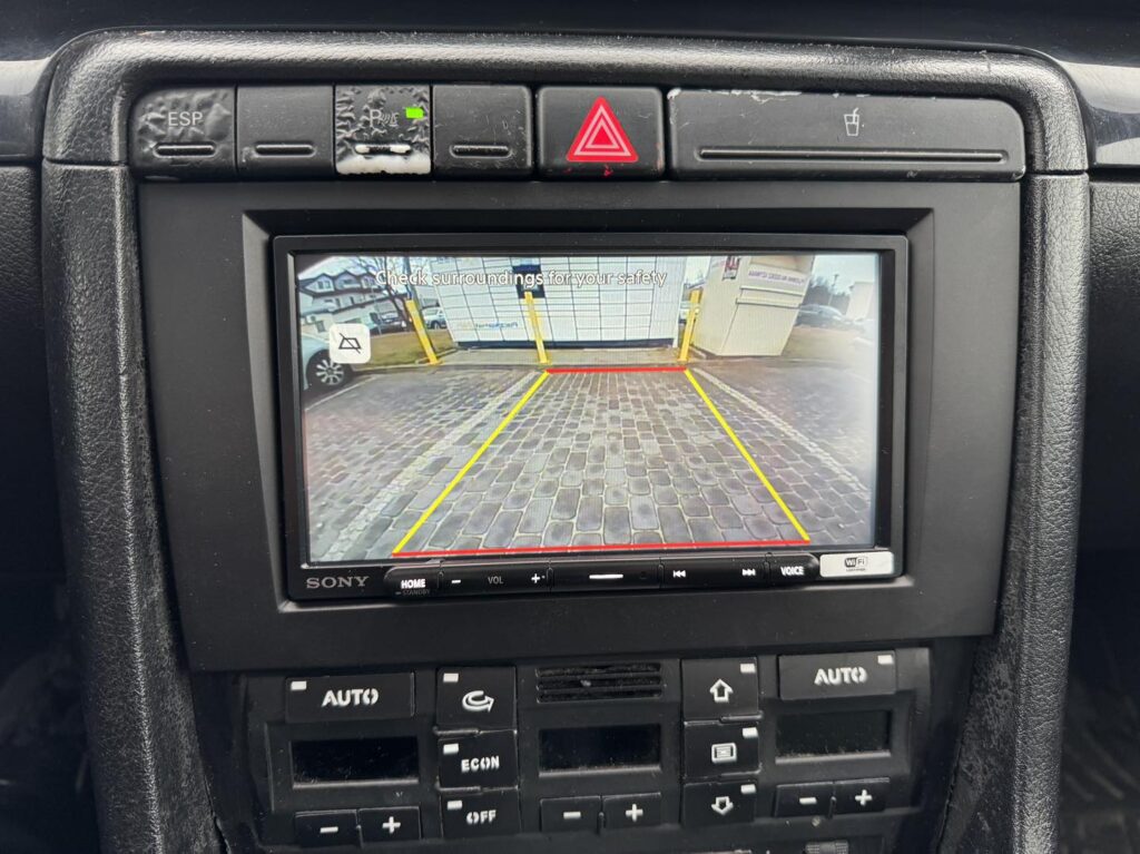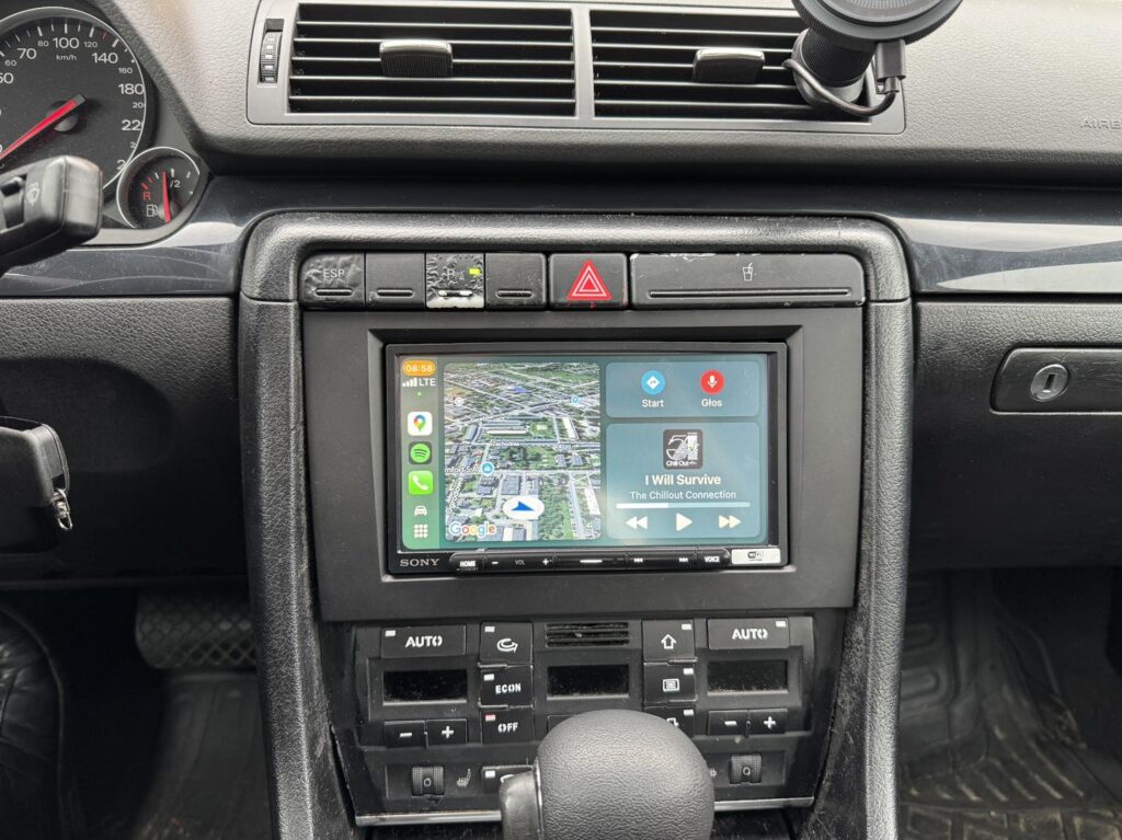 W Audi A4 B6 klienta zastąpiliśmy fabryczne radio nowoczesnym modelem Sony XAV-AX4050 z bezprzewodowym Apple CarPlay i Android Auto. Dzięki temu smartfon może zostać w kieszeni — nawigacja, muzyka i połączenia są teraz dostępne bezpośrednio na dużym, odblaskoodpornym ekranie. Bez dotykania telefonu i bez rozpraszania.