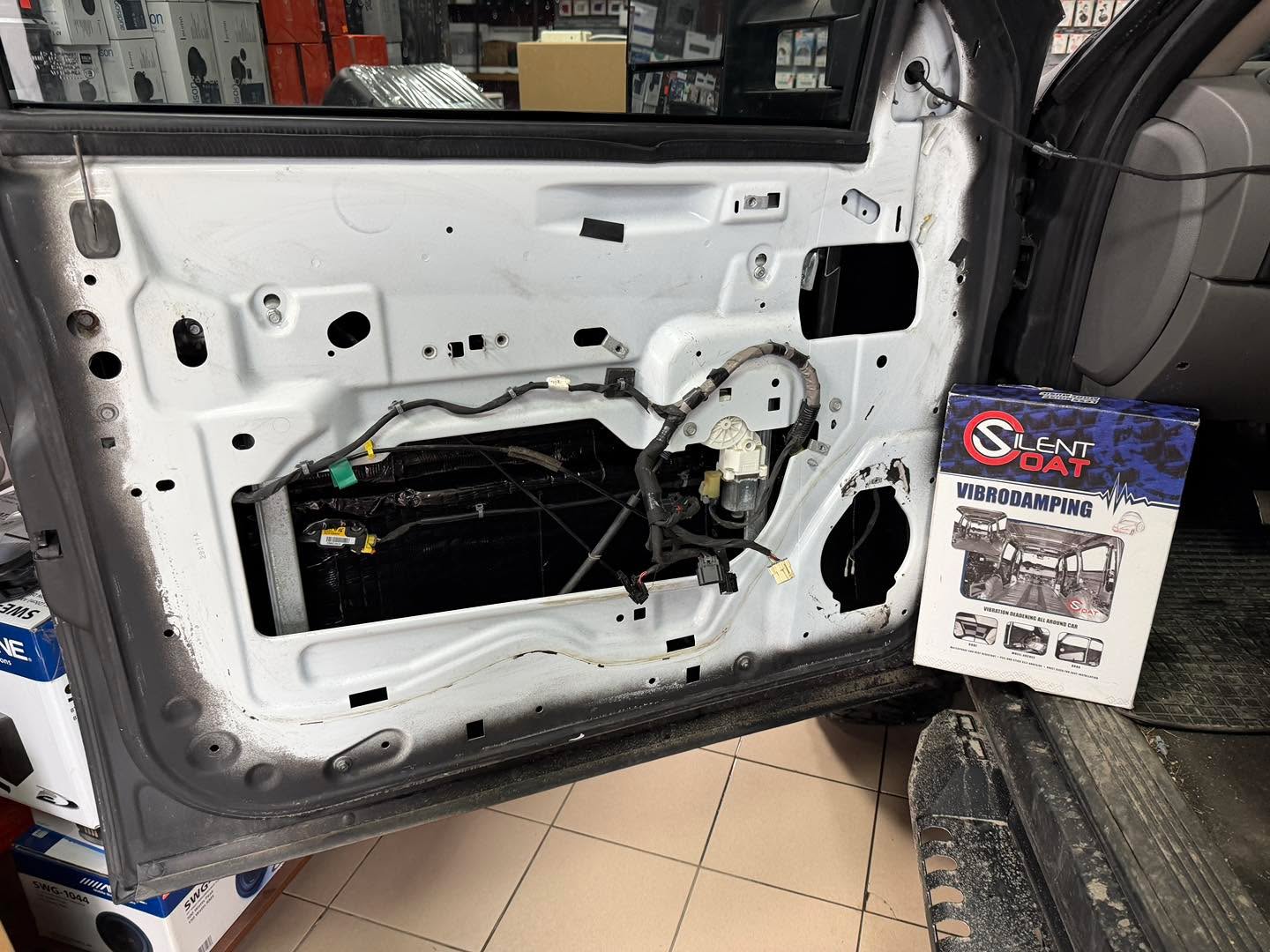 Zaczęliśmy od fundamentów, czyli kompletnego wygłuszenia drzwi matami Silent Coat. Wygłuszenie to jak przygotowanie płótna przed malowaniem – bez solidnej podstawy najlepsze głośniki nie wykażą pełni swoich możliwości. 🎨