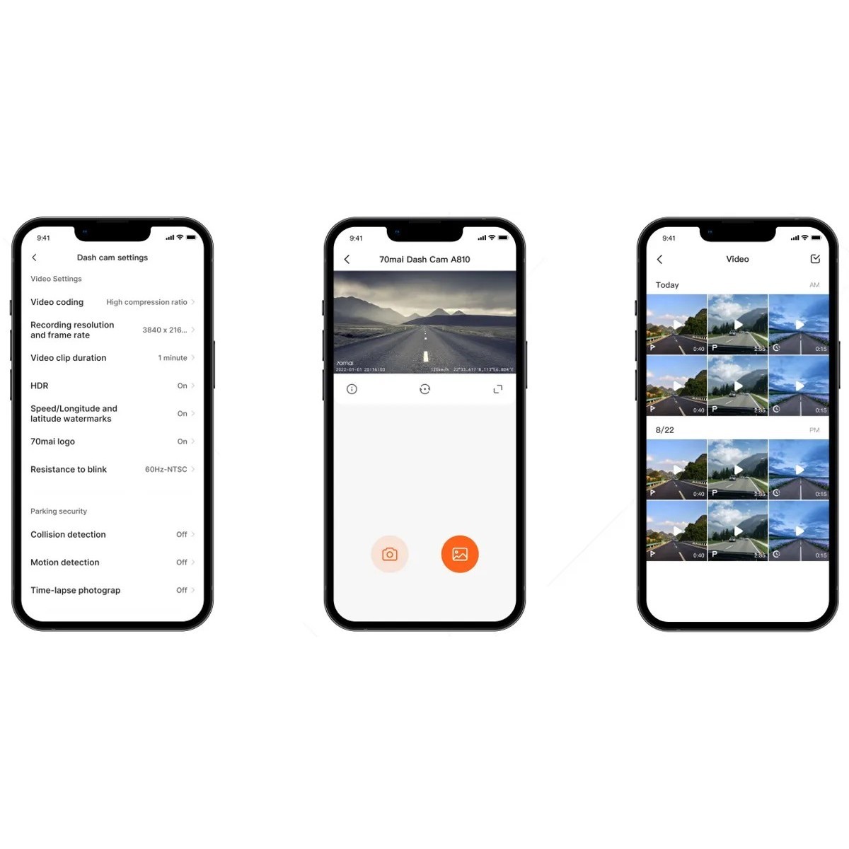Kamerę samochodową 70mai Dash Cam 4K A810 możesz obsługiwać poprzez dedykowaną aplikację 70mai, dostępną na systemy Android i iOS. Aplikacja umożliwia zarządzanie ustawieniami urządzenia oraz łatwe pobieranie wszystkich zdjęć i filmów. Nagrania awaryjne są dodatkowo zabezpieczone w specjalnym folderze zdarzeń.