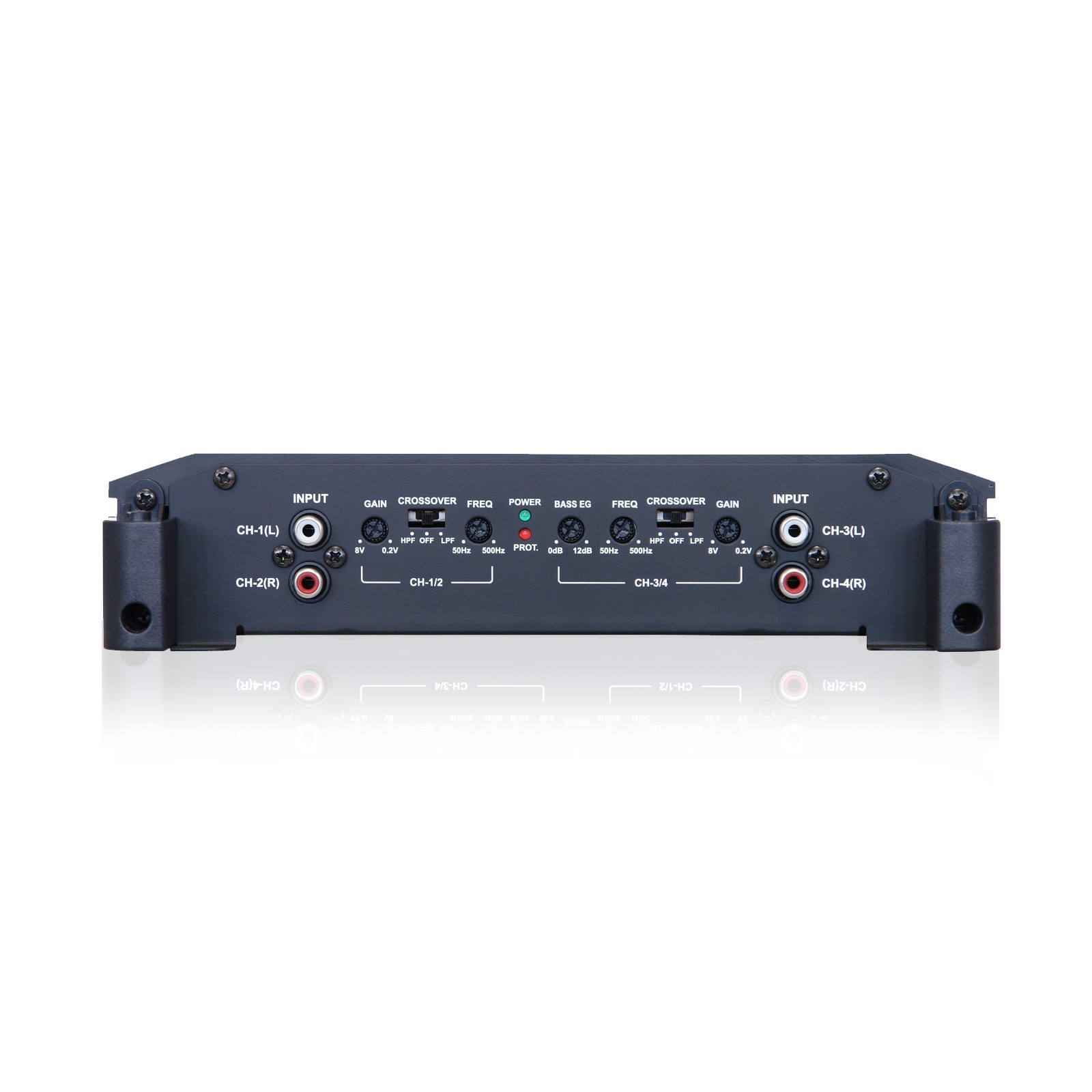 Urządzenie oferuje 2 pary wejść RCA z czułością regulowaną w zakresie 0.2 – 8.0 V. Wskaźnik statusu LED w kolorach zielonym i czerwonym informuje o stanie pracy wzmacniacza. Oprócz tego układ kanałów można konfigurować jako 4/3/2 kanały w zależności od potrzeb systemu.