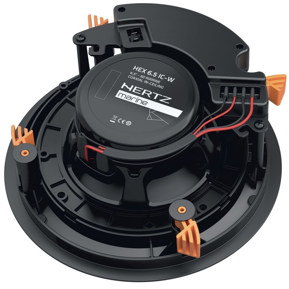 Głośnik sufitowy Hertz HEX 6.5 IC-W Marine to wodoodporny system audio o stopniu ochrony IP65 przeznaczony do montażu w ścianie lub suficie. Wyposażony w 165 mm głośnik niskotonowy ze stożkiem polipropylenu z inhibitorami UV oraz 24 mm głośnik wysokotonowy z kopułką Tetolon i magnesem neodymowym. Obsługuje moc szczytową 100W przy impedancji 6Ω i zapewnia pasmo przenoszenia 50-22000 Hz z czułością 88 dB SPL.