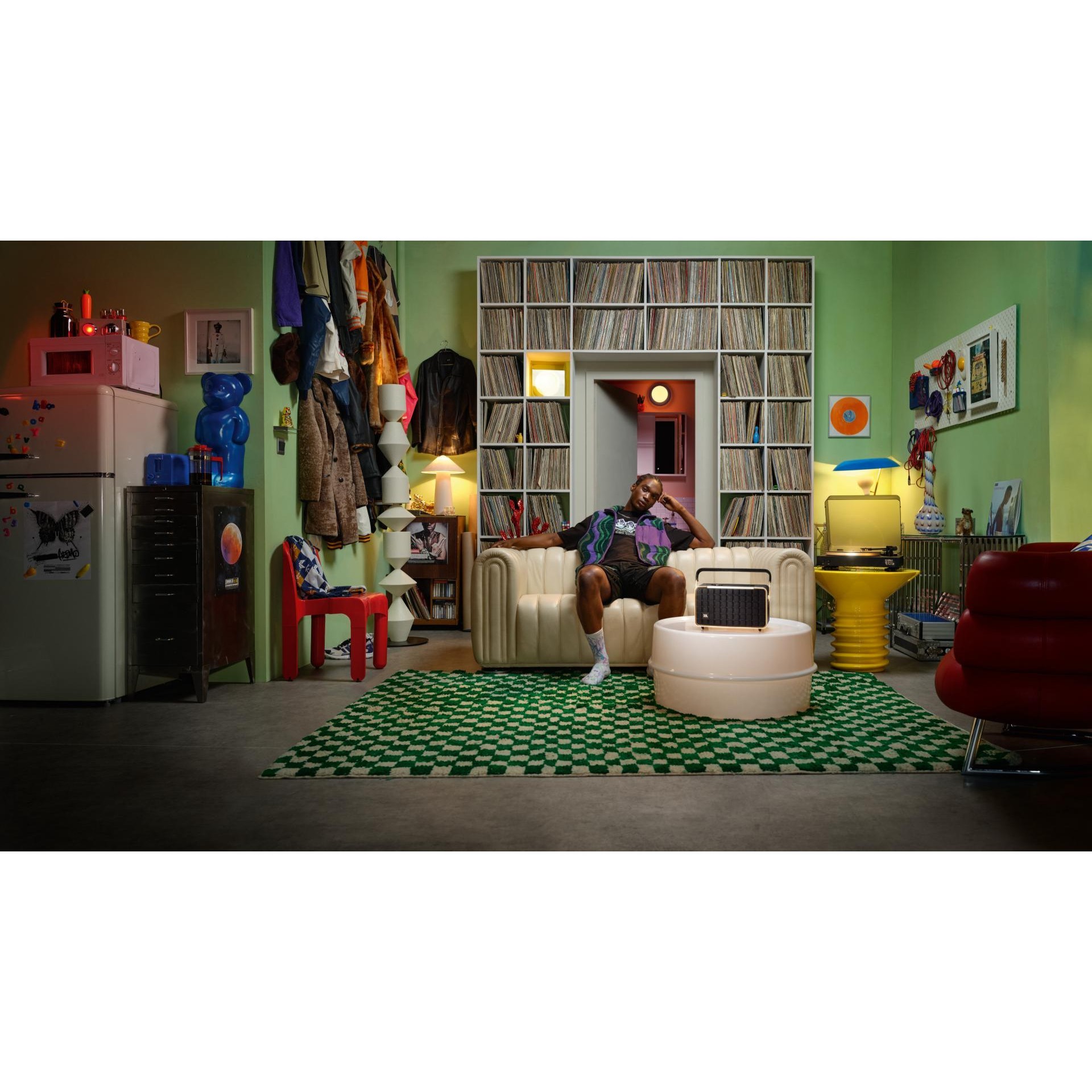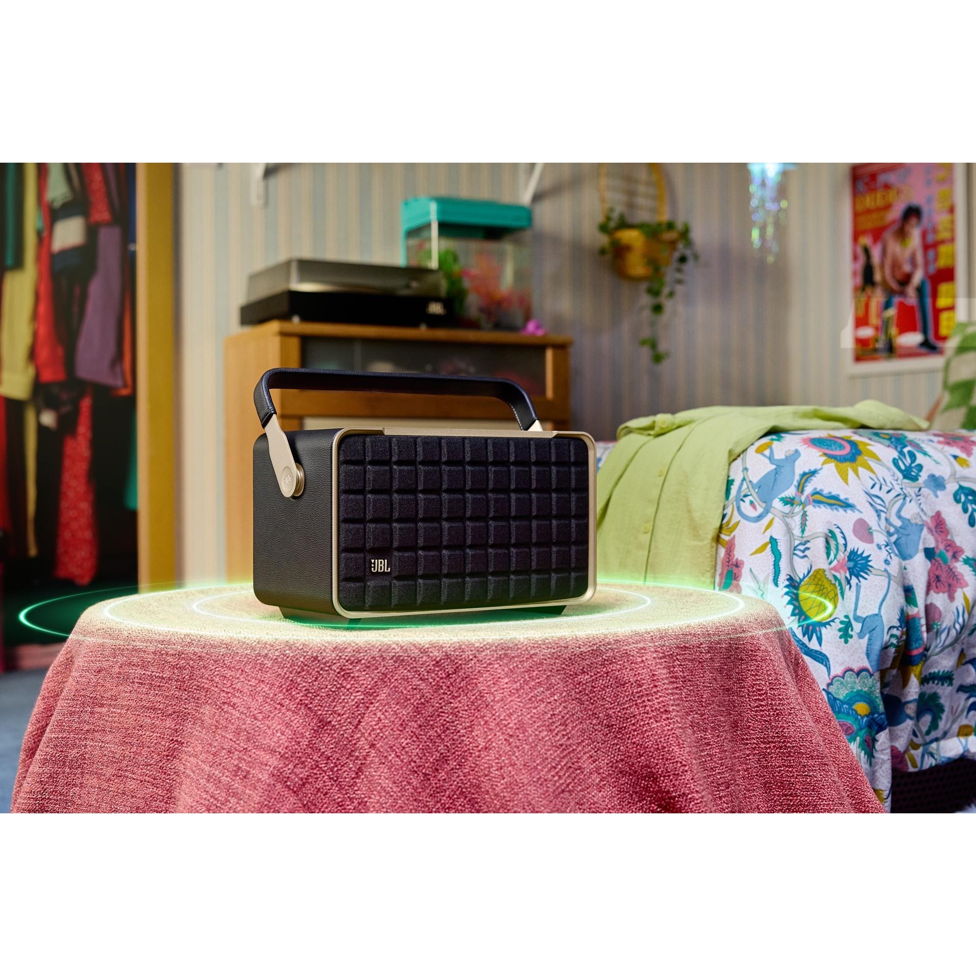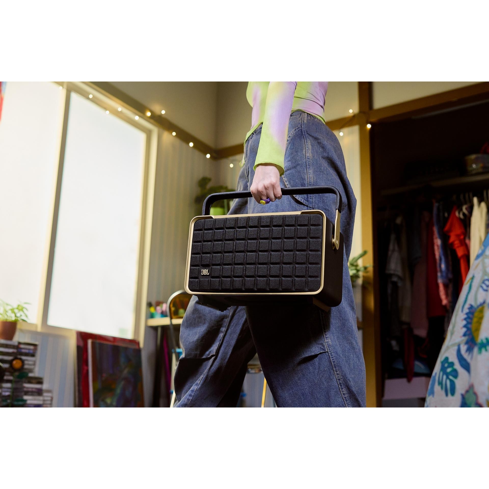 JBL Authentics 300 to jedyny spośród trzech modeli nowej serii JBL Authentics, który jest przenośny i posiada wbudowany akumulator zapewniający do 8 godzin pracy. Dzięki skórzanej obudowie głośnika, wygodnemu metalowemu uchwytowi i wbudowanemu akumulatorowi muzykę można zabrać ze sobą w każde miejsce – od kuchni po sypialnię, a nawet w podróż. Design inspirowany stylem retro z lat 70. z kultową kratą Quadrex robi wrażenie w każdym miejscu.