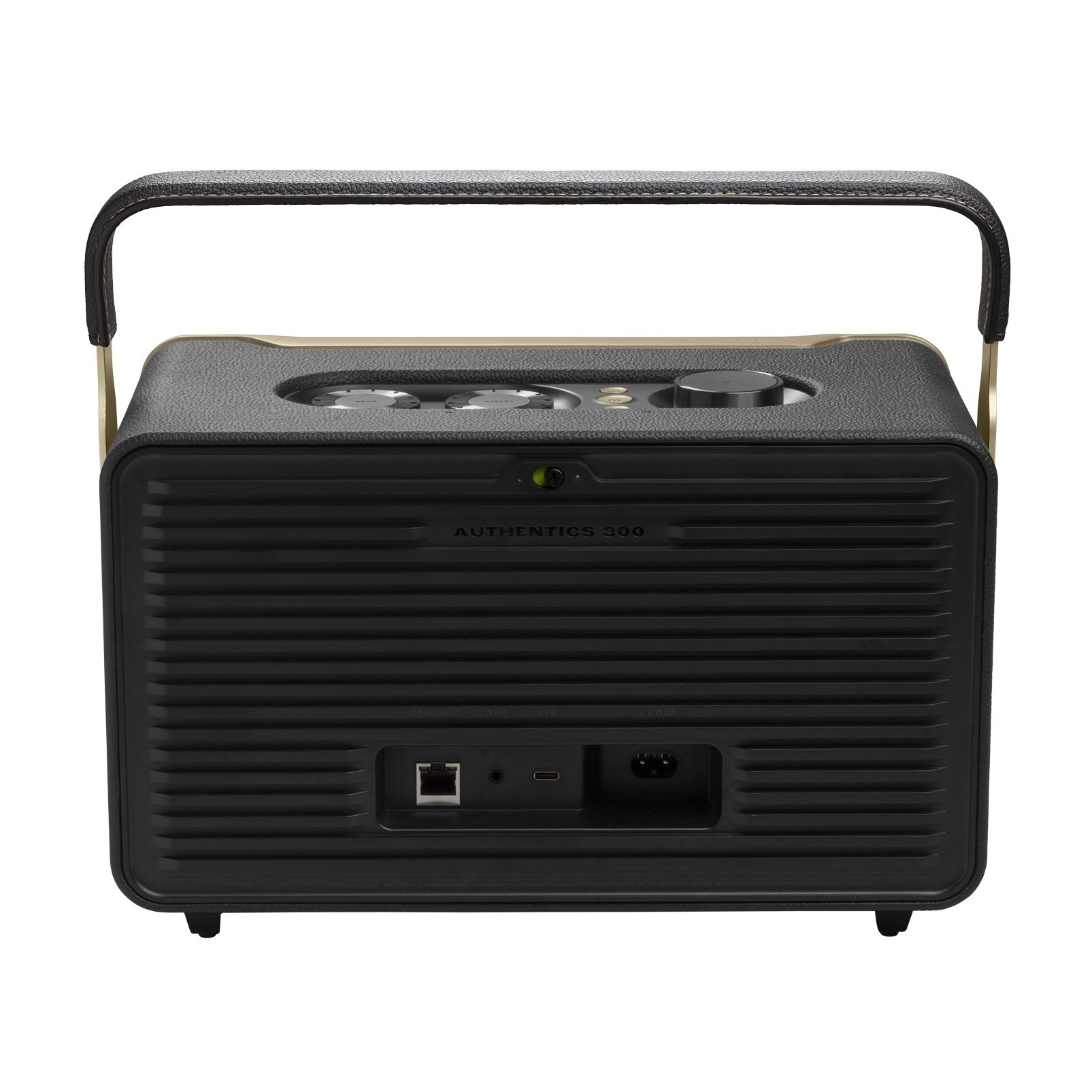 JBL Authentics 300 to przenośny inteligentny głośnik domowy w stylu retro z łącznością Wi-Fi, Bluetooth 5.3 i wbudowanym akumulatorem zapewniającym do 8 godzin pracy. Wyposażony w system stereo 2.0 z mocą 100W, Google Assistant i Amazon Alexa, obsługuje AirPlay, Chromecast built-in oraz Spotify Connect. Posiada 2 głośniki wysokotonowe 25mm, niskotonowy 5,25 cala i pasywny radiator 6,5 cala z pasmem przenoszenia 45 Hz–20 kHz.