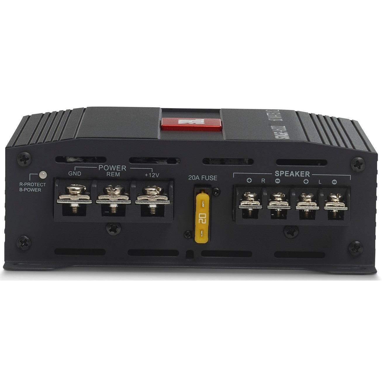 Urządzenie wyposażono w kompleksowe obwody ochronne, które zabezpieczają przed zwarciem, przegrzaniem, przepięciem i podnapięciem. Wzmacniacz posiada bezpiecznik 20A oraz kompaktowe wymiary 50 x 145 x 156.6 mm, co ułatwia montaż w ograniczonej przestrzeni pojazdu.