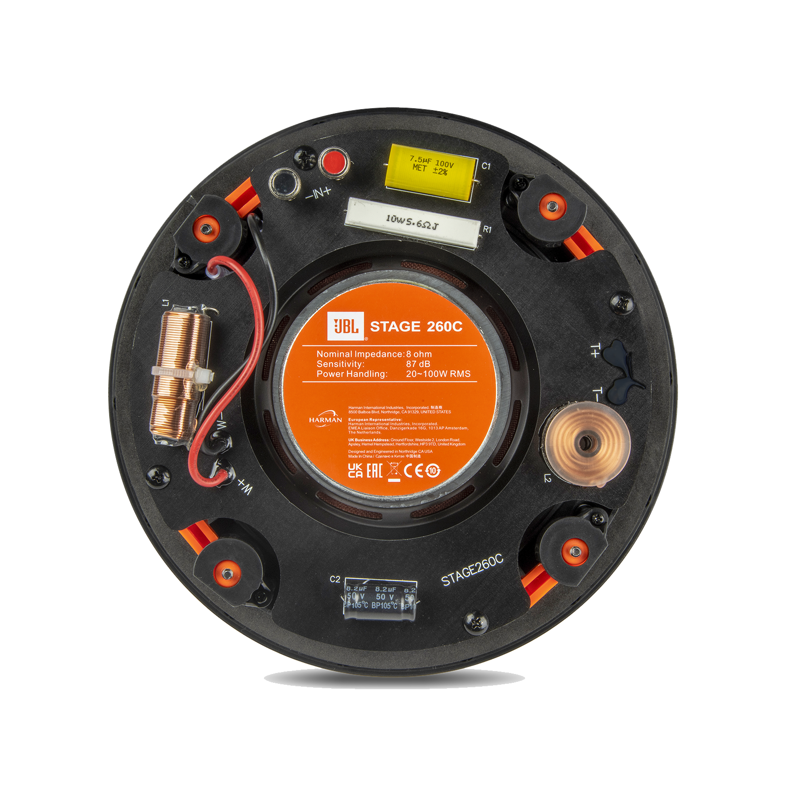 JBL Stage 260C ma 6,5″ (165 mm) stożkowy głośnik niskotonowy z policelulozy i 1″ (25 mm) aluminiową kopułkę wysokotonową z falowodem z soczewką akustyczną. Wizualnie dyskretna maskownica z zerową ramką i łatwa instalacja sprawiają, że ten głośnik jest słyszalny i niewidoczny.