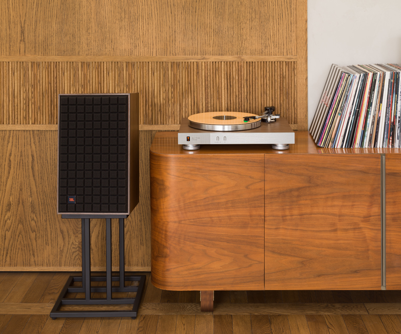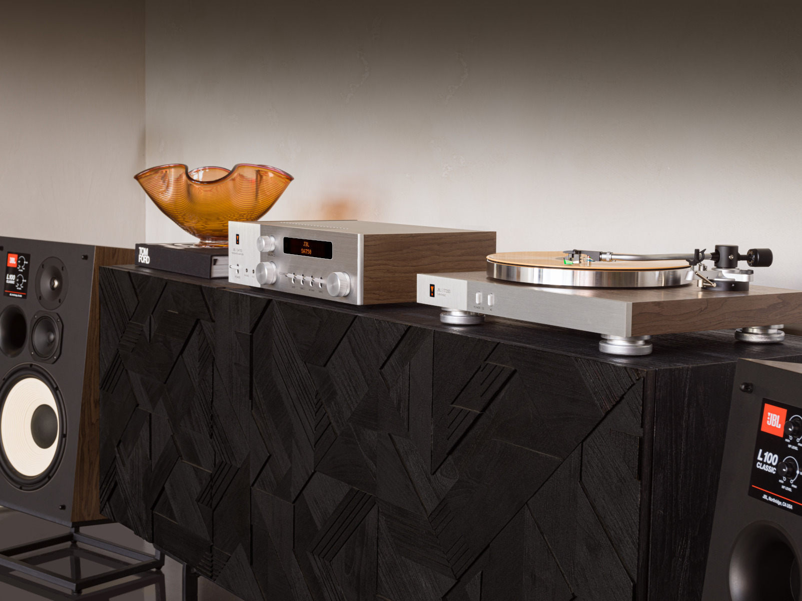 Gramofon JBL TT350 Classic z cokołem fornirowanym naturalnym orzechem włoskim, ciężkim aluminiowym talerzem i silnikiem Direct Drive. Wyposażony w aluminiowe ramię ze zdejmowaną głowicą, wstępnie zainstalowaną wkładką Audio Technica VM95E oraz regulacją VTA dla łatwej modernizacji. Obsługuje prędkości 33,3 i 45 obr/min z zablokowanym taktowaniem dla idealnej wysokości dźwięku.