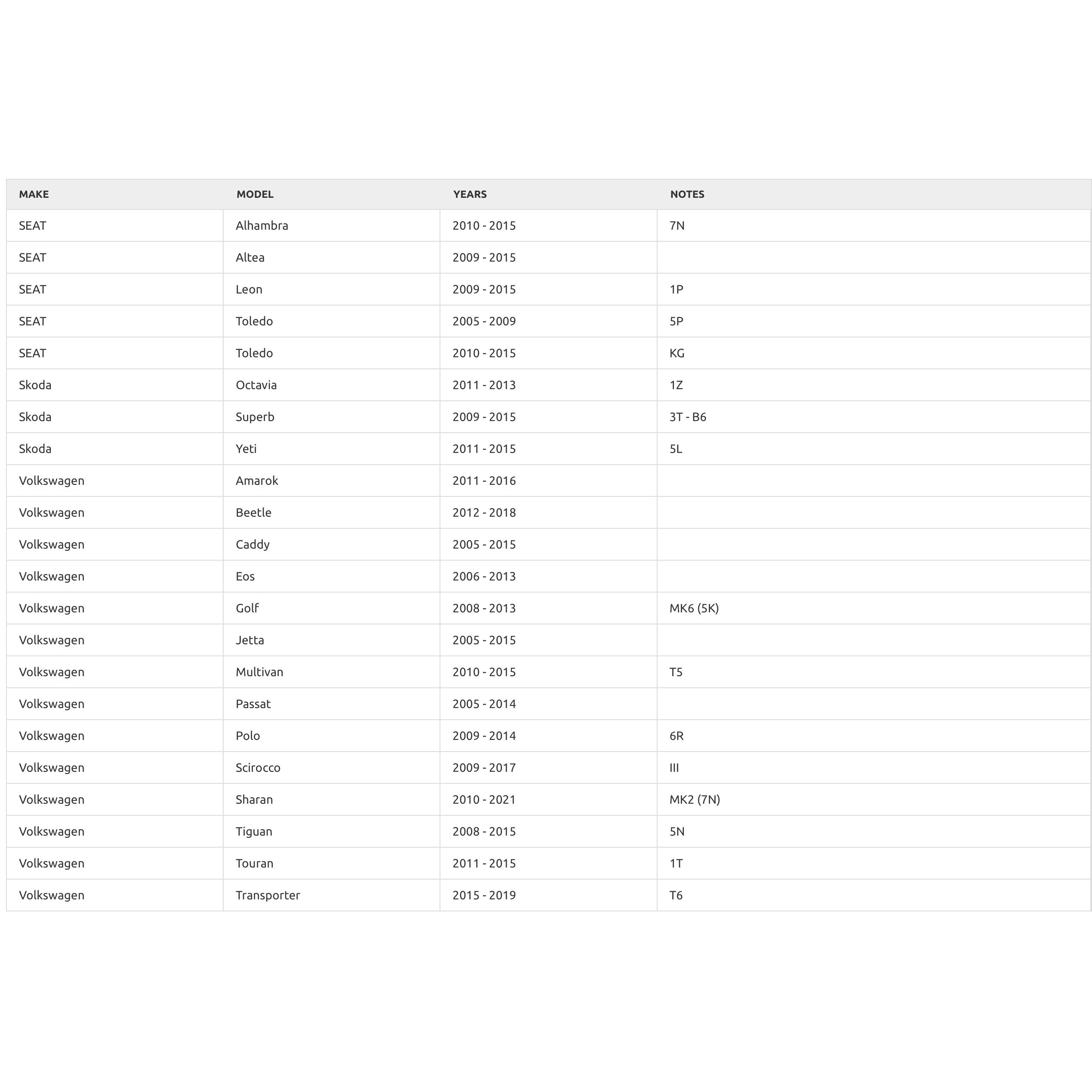 W przypadku pojazdów Seat interfejs współpracuje z modelami Leon 1P (2009-2015), Altea (2009-2015), Toledo 5P (2005-2009), Toledo KG (2010-2015) oraz Alhambra 7N (2010-2015). Jeśli chodzi o pojazdy Skoda, moduł obsługuje Octavia 1Z (2011-2013), Superb 3T-B6 (2009-2015) oraz Yeti 5L (2011-2015).