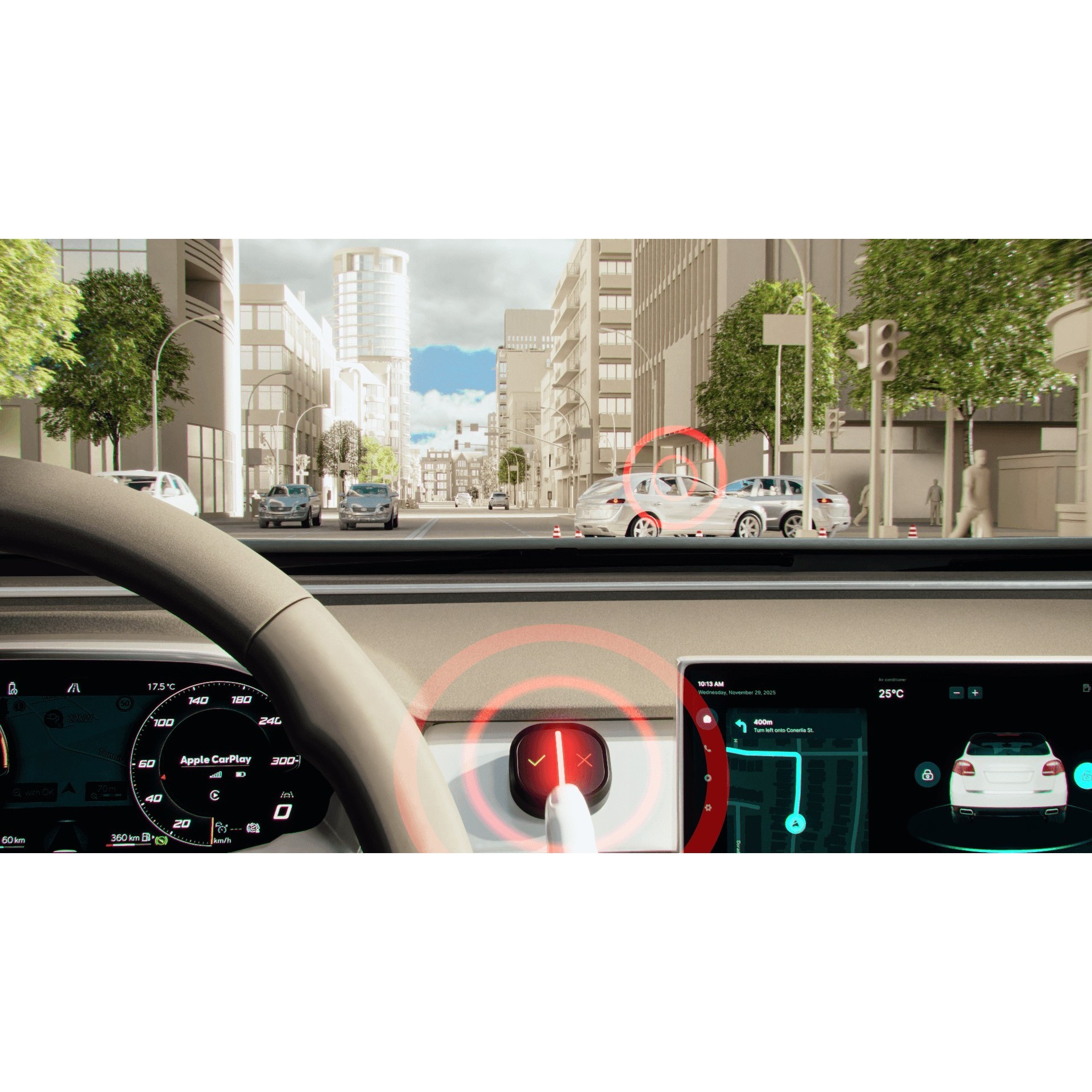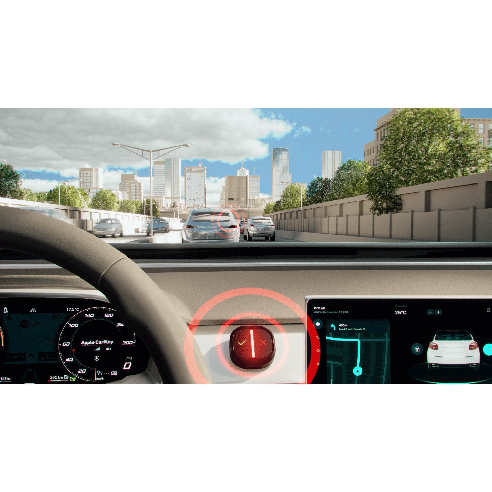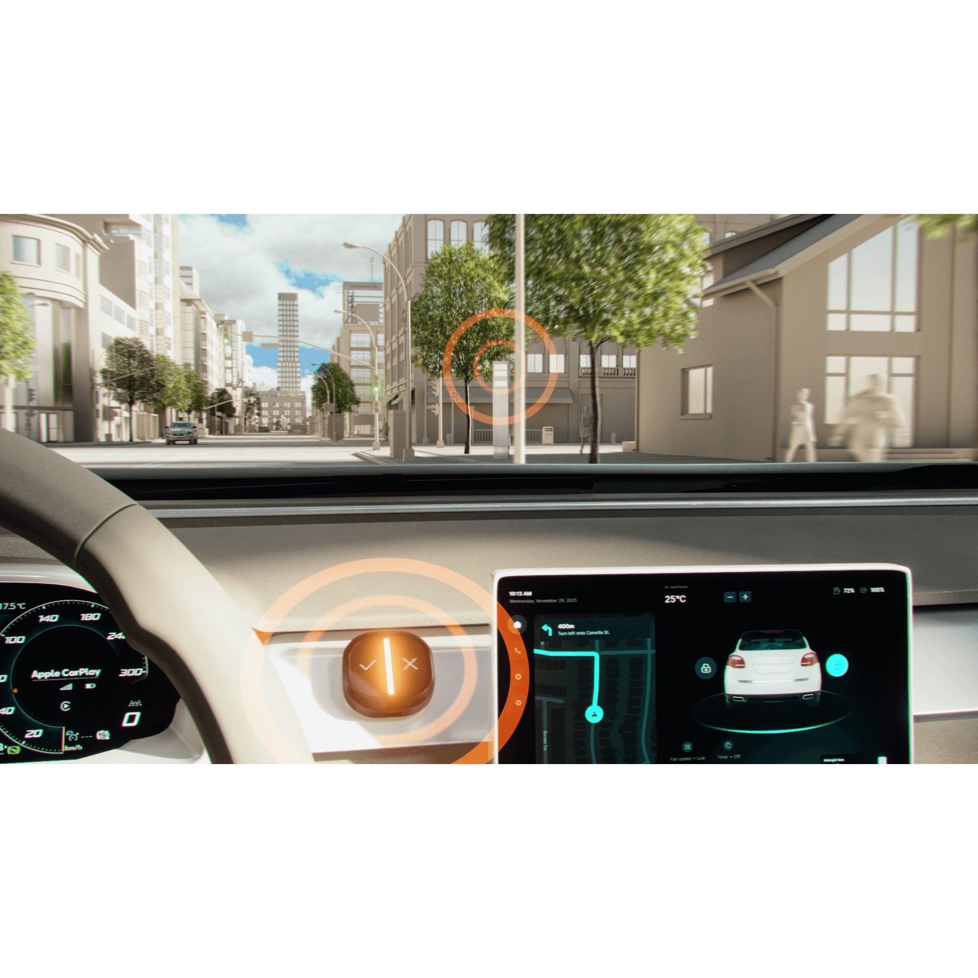Dodawanie i odwoływanie zgłoszeń odbywa się jednym przyciskiem, bez odrywania uwagi od drogi. Komunikaty są przekazywane wizualnie i głosowo, umożliwiając szybkie reagowanie na sytuacje drogowe. Niewielki rozmiar urządzenia (45 x 45 x 15 mm) sprawia, że nie rzuca się w oczy w samochodzie, pozostając jednocześnie funkcjonalny i czujny.