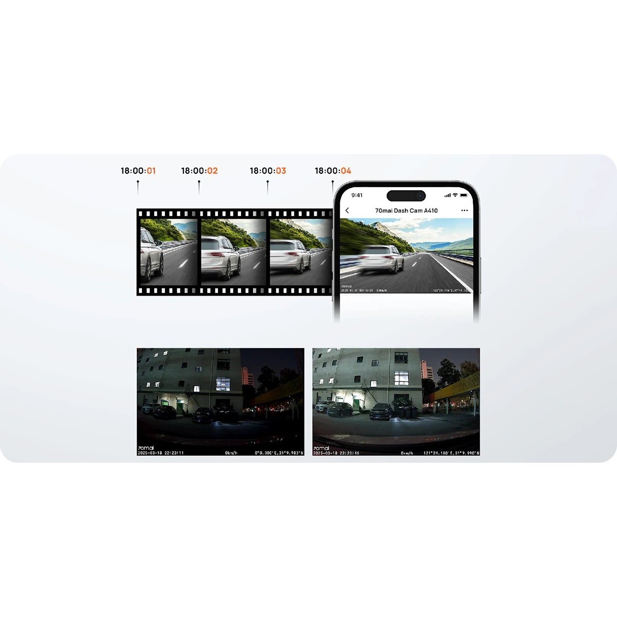 Zestaw zawiera inteligentny wideorejestrator 70mai A410 z rozdzielczością 2.5K z przodu i kamerą tylną 70mai RC21 1080P z tyłu. Wyposażony w ultraszeroki obiektyw F1.55 zapewnia doskonałe widzenie nocne oraz 78% więcej szczegółów niż standardowe kamery 1080P. Ponadto oferuje całodobową ochronę parkingu, precyzyjne pozycjonowanie GPSorazobsługę kart microSD do 256GB.