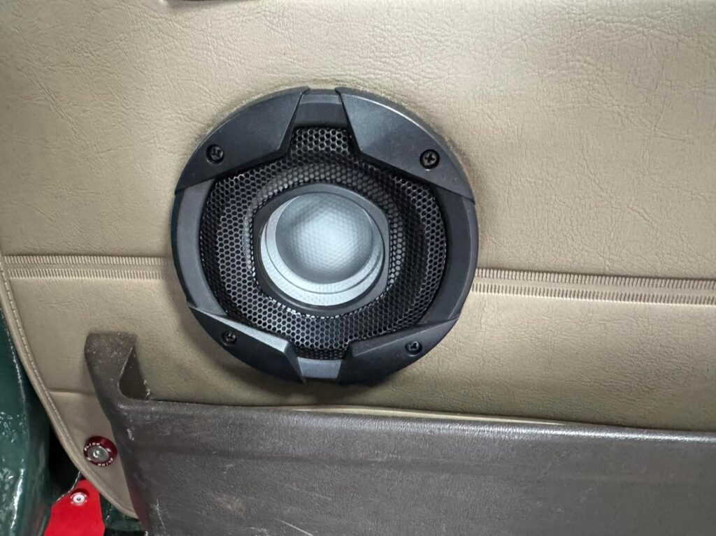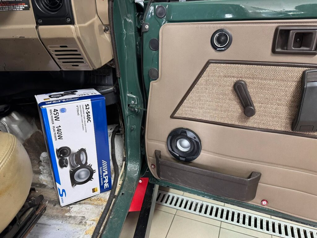 Razem z klientem wybraliśmy odpowiednie nagłośnienie. Postawiliśmy na głośniki Alpine S2-S40C z certyfikatem Hi-Res Audio – te małe, 10-centymetrowe zestawy potrafią odtworzyć częstotliwości do 40 kHz i świetnie radzą sobie nawet przy dużej głośności. 🔈