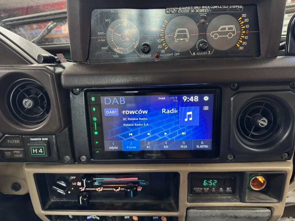 Do tego zainstalowaliśmy radio Pioneer SPH-DA77DAB z dużym, 6,8-calowym ekranem oraz bezprzewodowym Apple CarPlay i Android Auto. Dzięki temu właściciel ma dostęp do nawigacji, Spotify i wszystkich ulubionych aplikacji prosto ze smartfona. 📱Radio idealnie wpasowało się w fabryczne miejsce po starym odtwaczaczu.